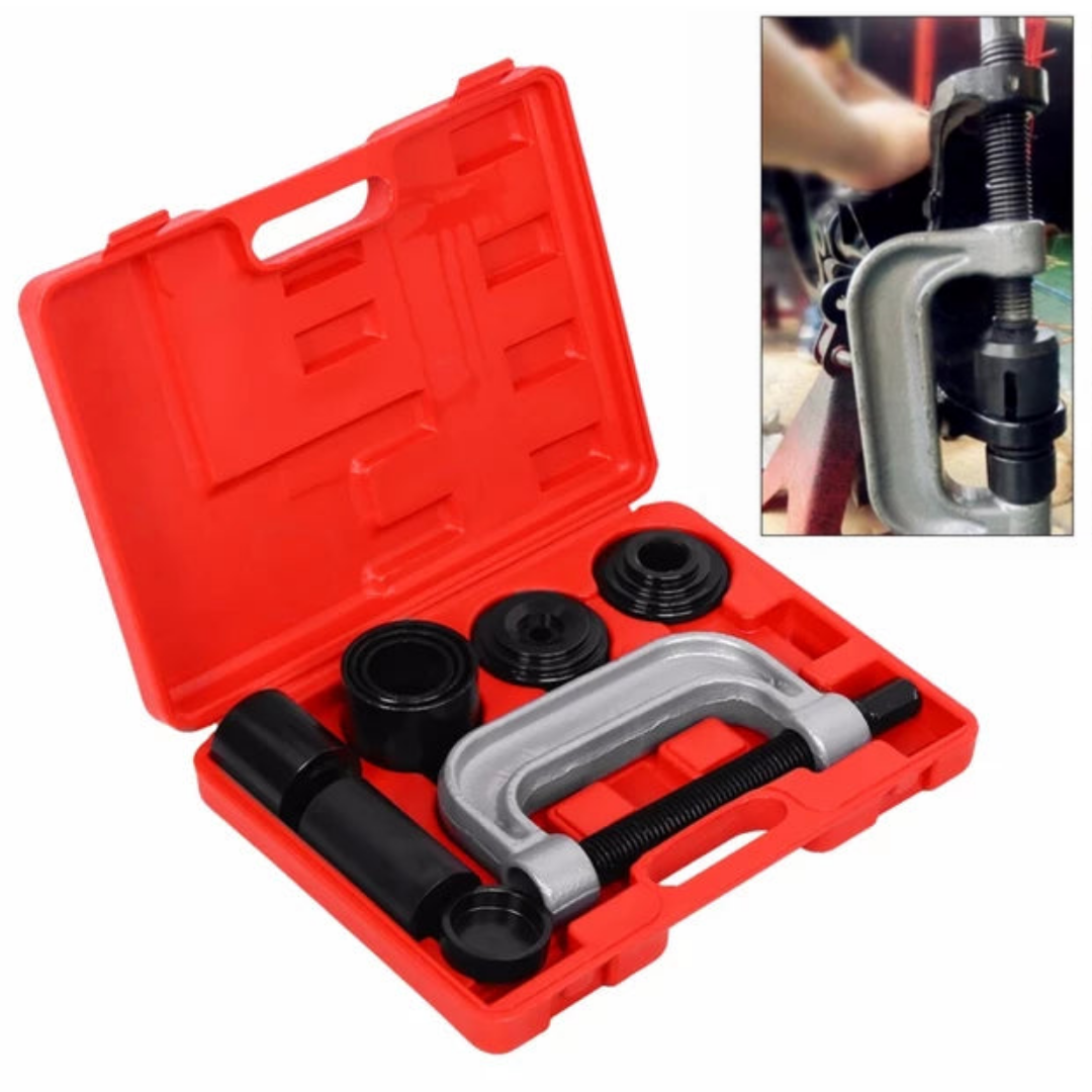 Ovaj 4-u-1 set alata dizajniran je za jednostavno i učinkovito uklanjanje i ugradnju kuglastih ležajeva, univerzalnih zglobova i kočionih klinova na vozilima. Robustna konstrukcija od čelika osigurava trajnost i otpornost na zahtjevne uvjete rada, dok “C” preša i različiti adapteri omogućuju široku primjenu na osobnim i teretnim vozilima.