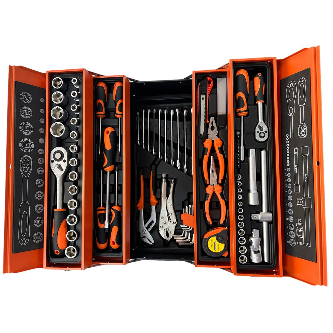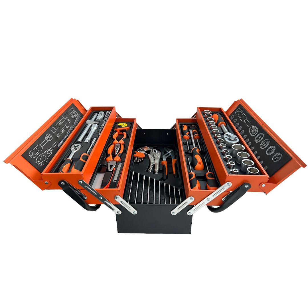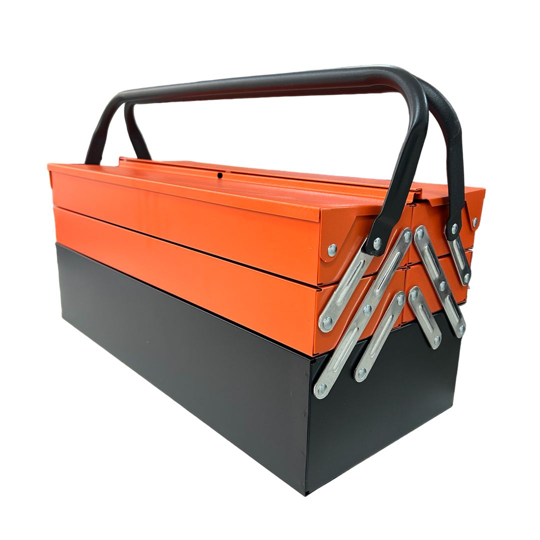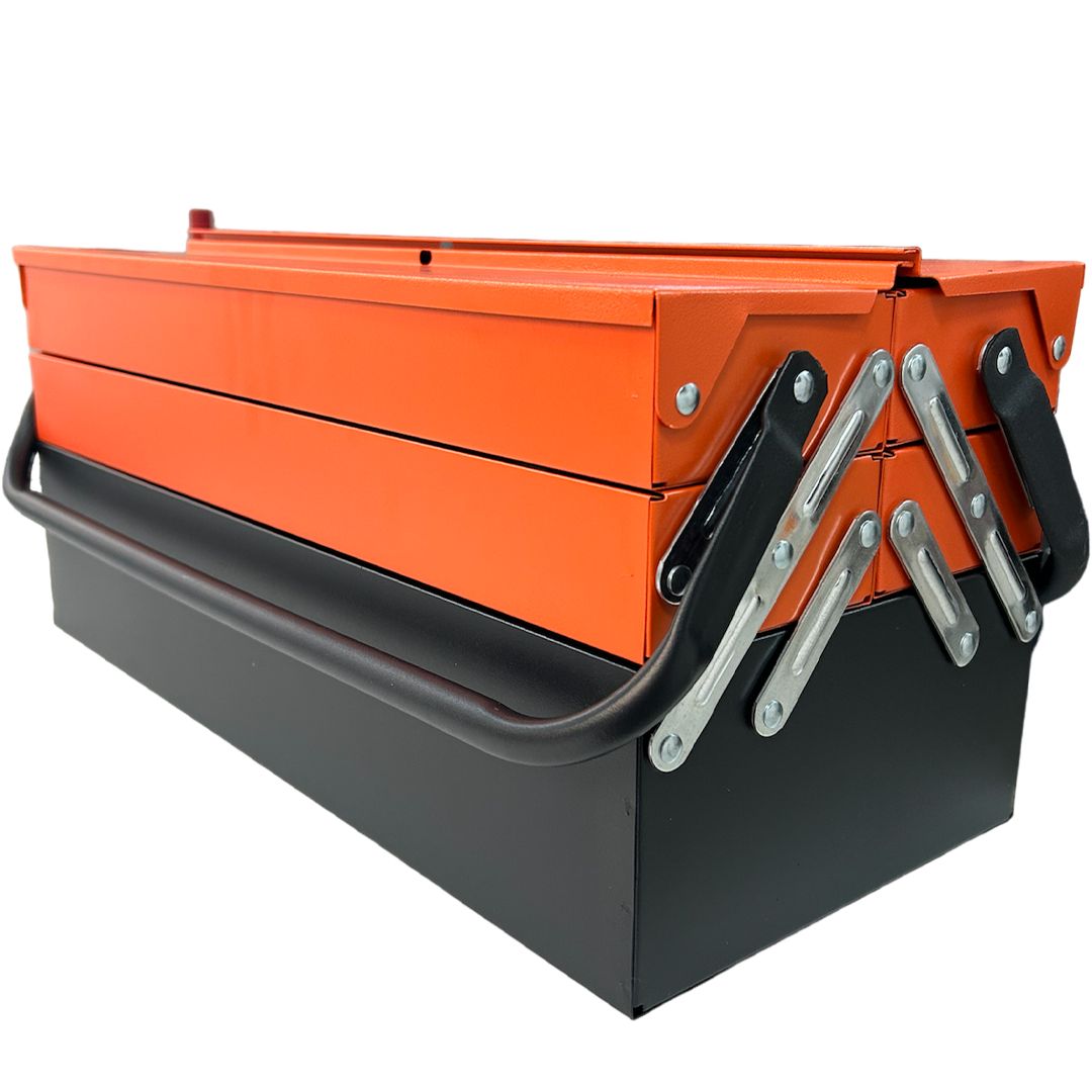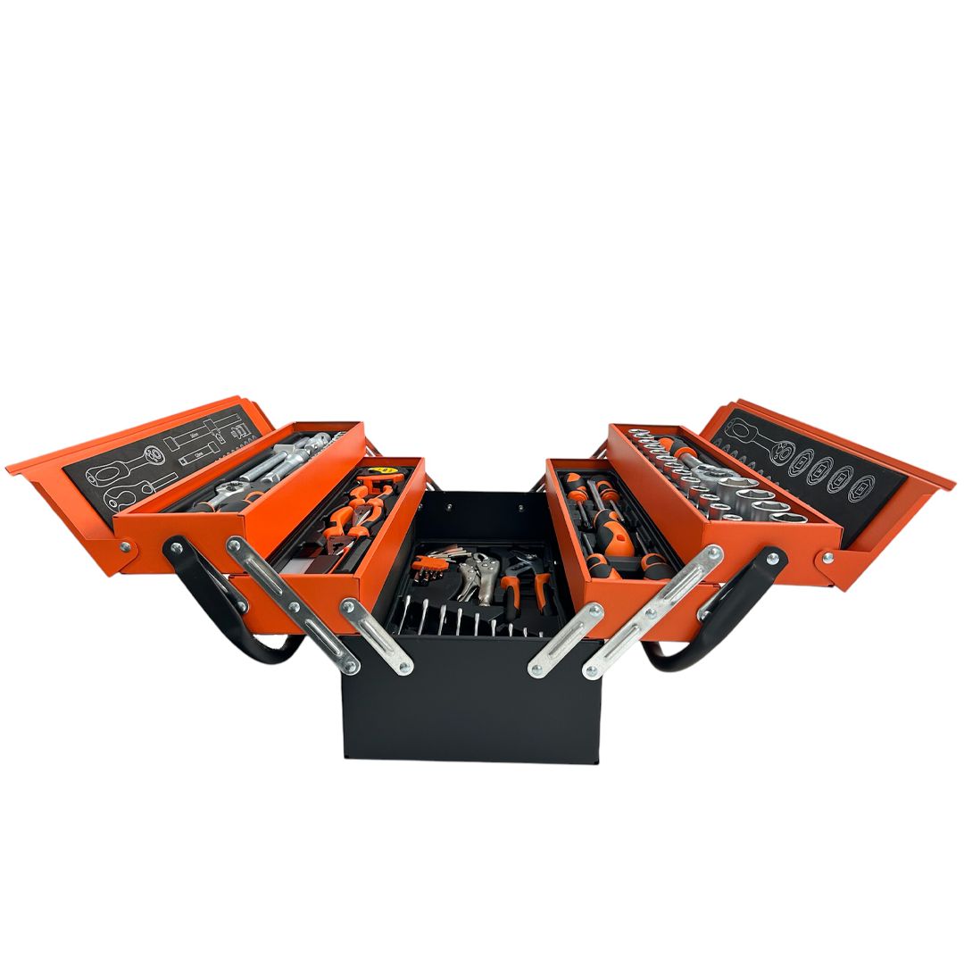 - 📏 Kutija ima tri kata i otvara se srednjim mehanizmom stepenica, što olakšava organizaciju alata.