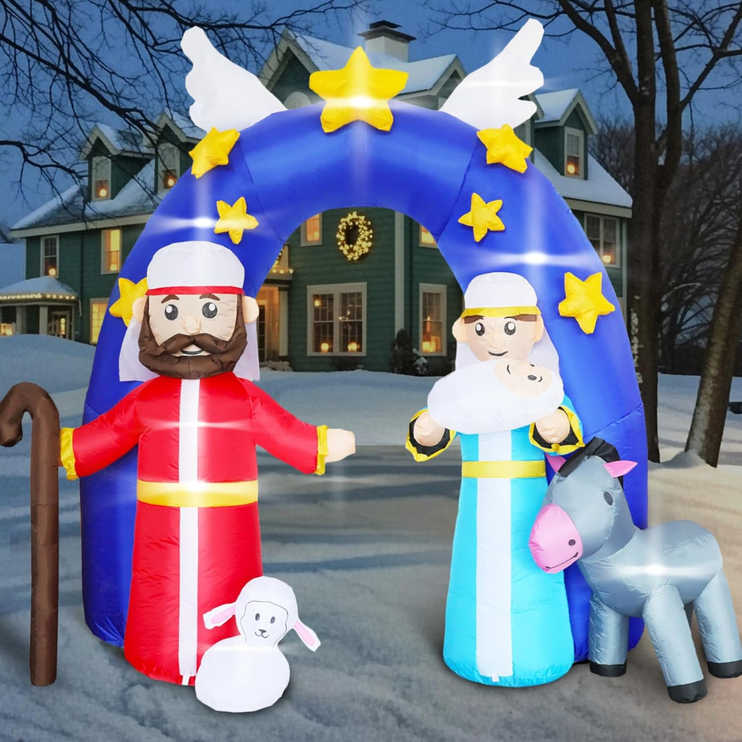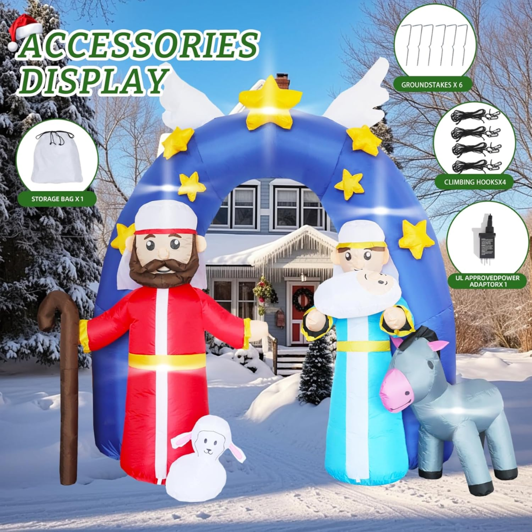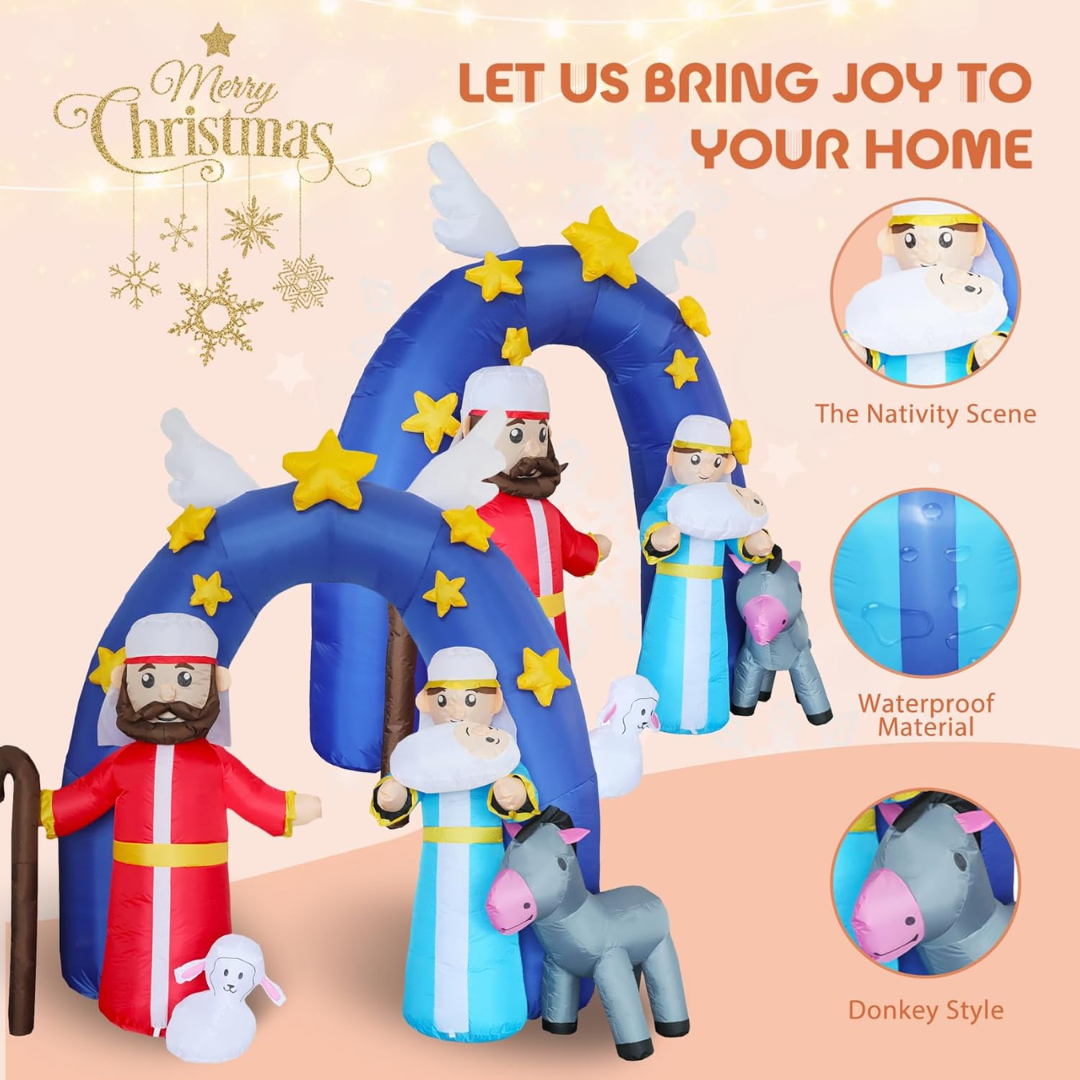 Ovaj napuhani božićni portal s jaslicama donosi toplinu i simboliku Božića, a pritom stvara WOW efekt koji oduševljava djecu i odrasle. Savršen je za stvaranje nezaboravnih blagdanskih trenutaka i fotografija, ali i za gostoljubivu dobrodošlicu svima koji vam dolaze u posjet.