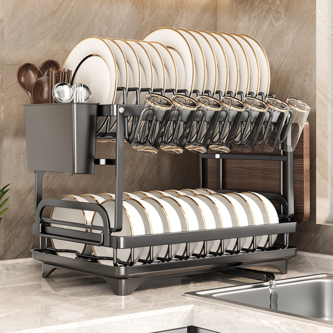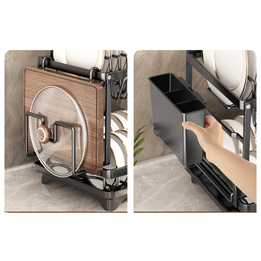 Ovaj organizator za suđe omogućuje učinkovito sušenje većih količina tanjura, čaša i zdjelica, dok donja razina služi kao dodatna površina za šalice i posuđe. Uklonjivi držač za pribor za jelo može se postaviti po želji, što olakšava prilagodbu prostoru.