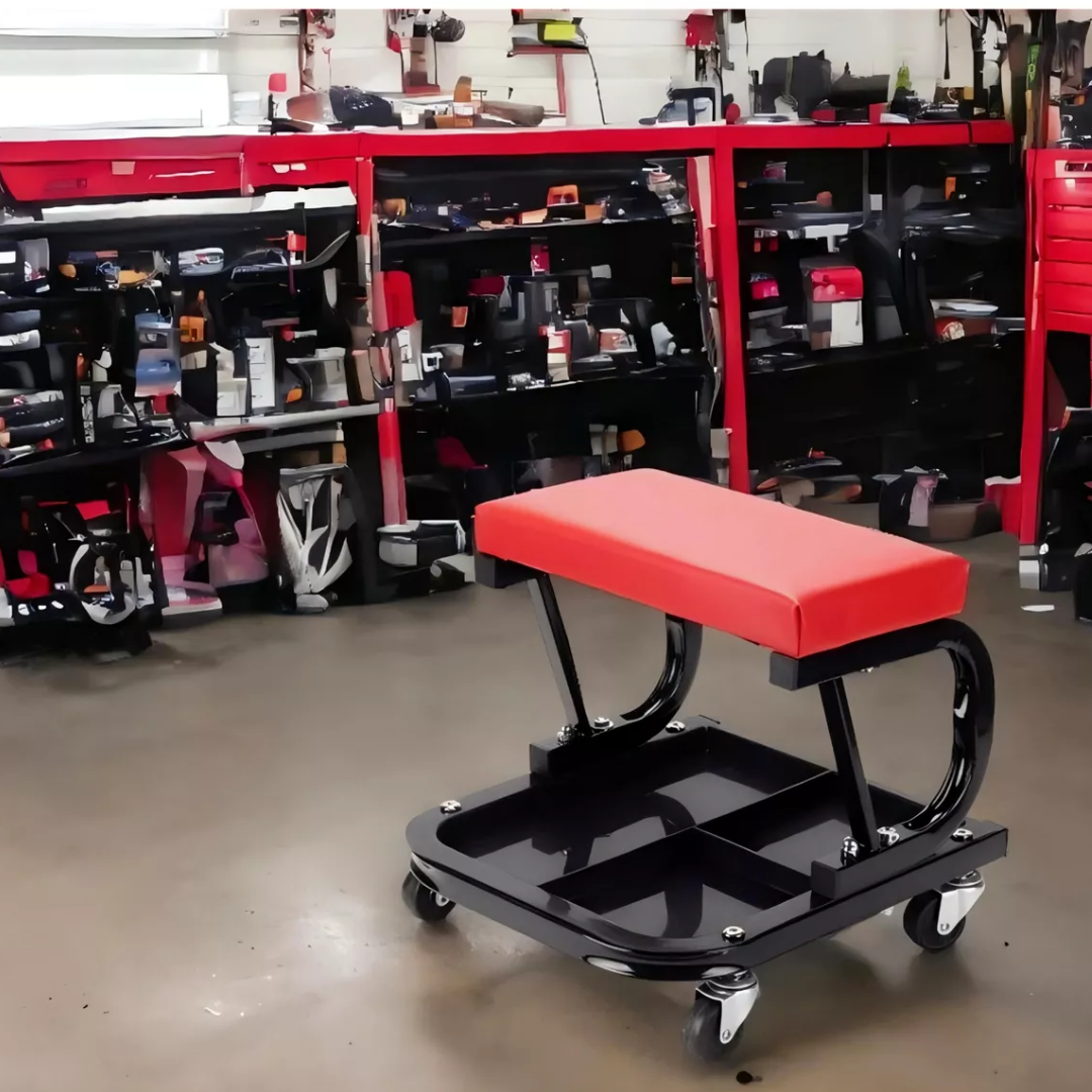 Rad u niskim položajima često je naporan, neugodan i povećava opterećenje na leđa i koljena. Ovaj mehaničarski stolac dizajniran je kako bi upravo te probleme riješio. Pruža udobno sjedenje, stabilan oslonac i praktičnu površinu za alat – sve u kompaktnom i mobilnom obliku koji se lako kreće po garaži ili radionici.