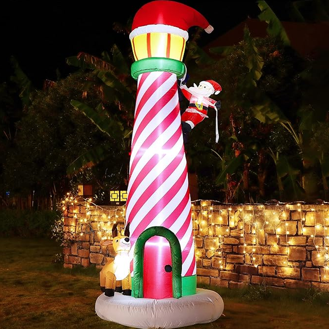 Svjetionik dolazi u živopisnim crveno-bijelim prugama, dok Djed Mraz veselo "penje" uz njega, a Rudolf, njegov vjerni sob, pozdravlja goste na ulazu.