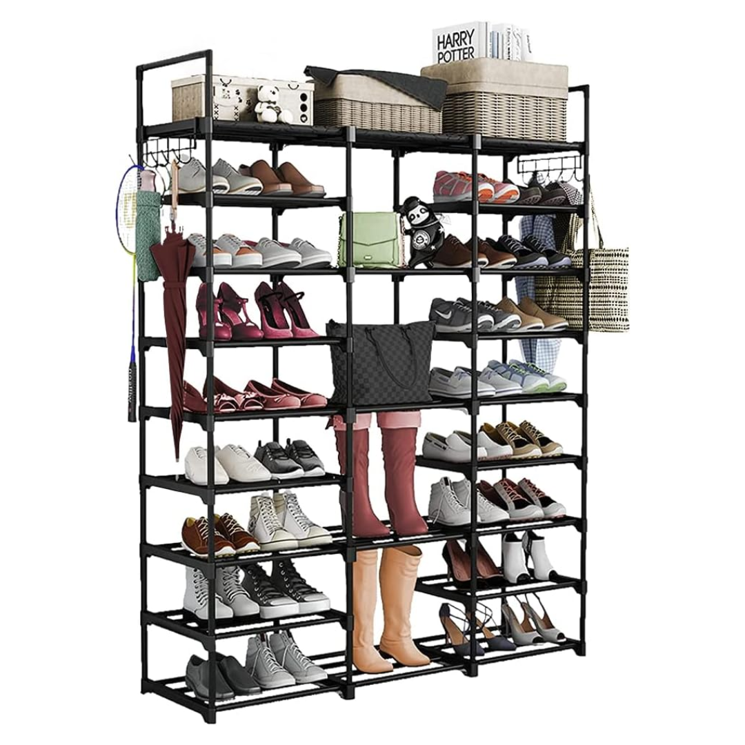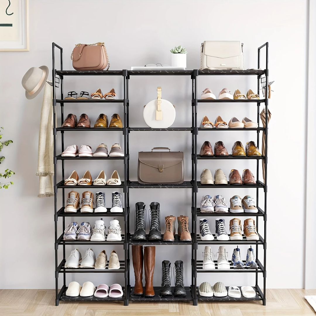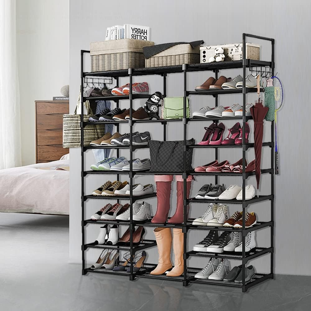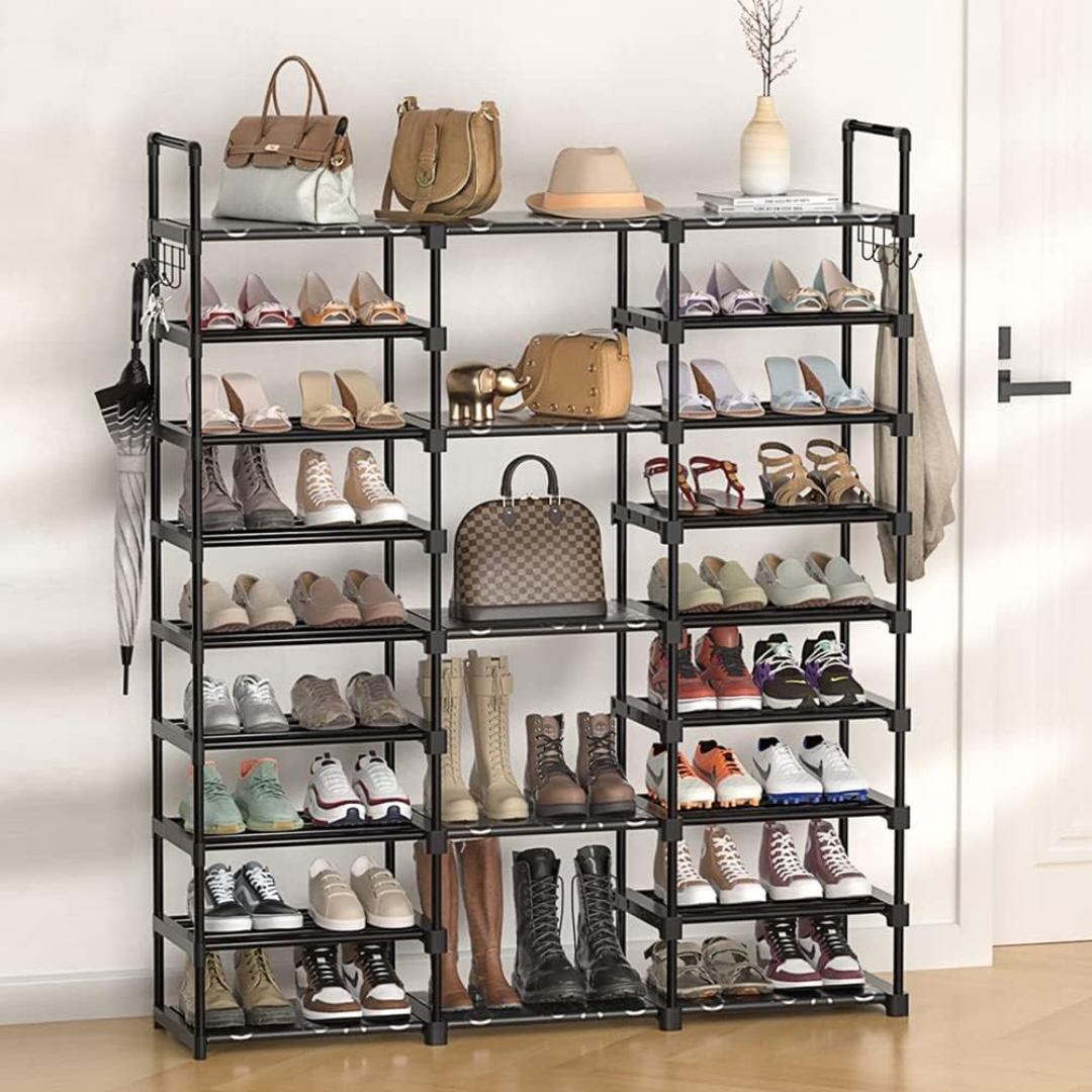 9 slojeva, 3 stupca – možeš ukloniti razine i pohraniti visoke čizme ili veću obuću. Dimenzije: 127 × 30 × 58 cm.