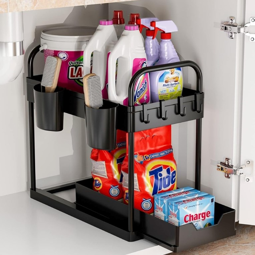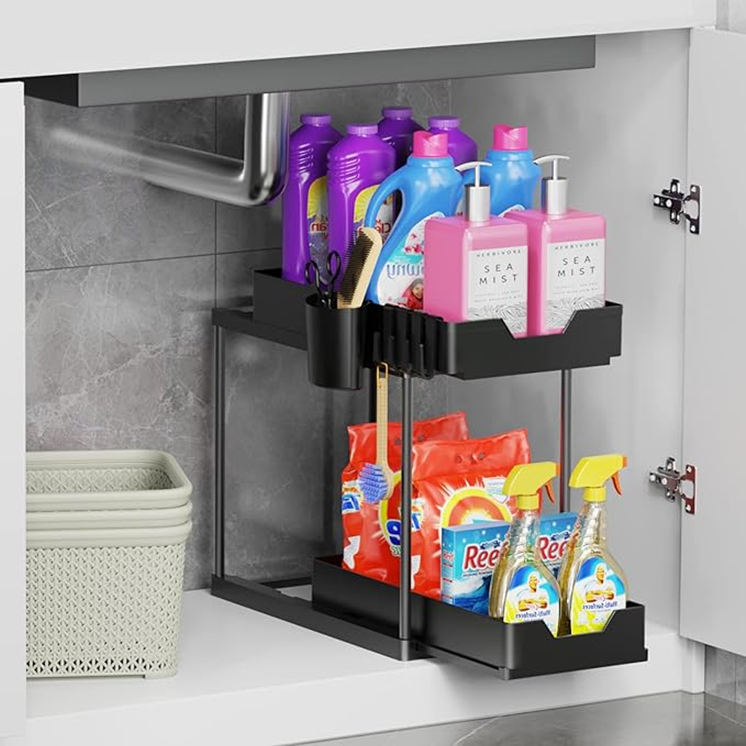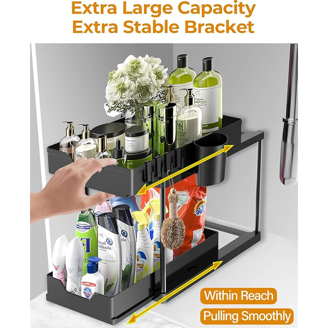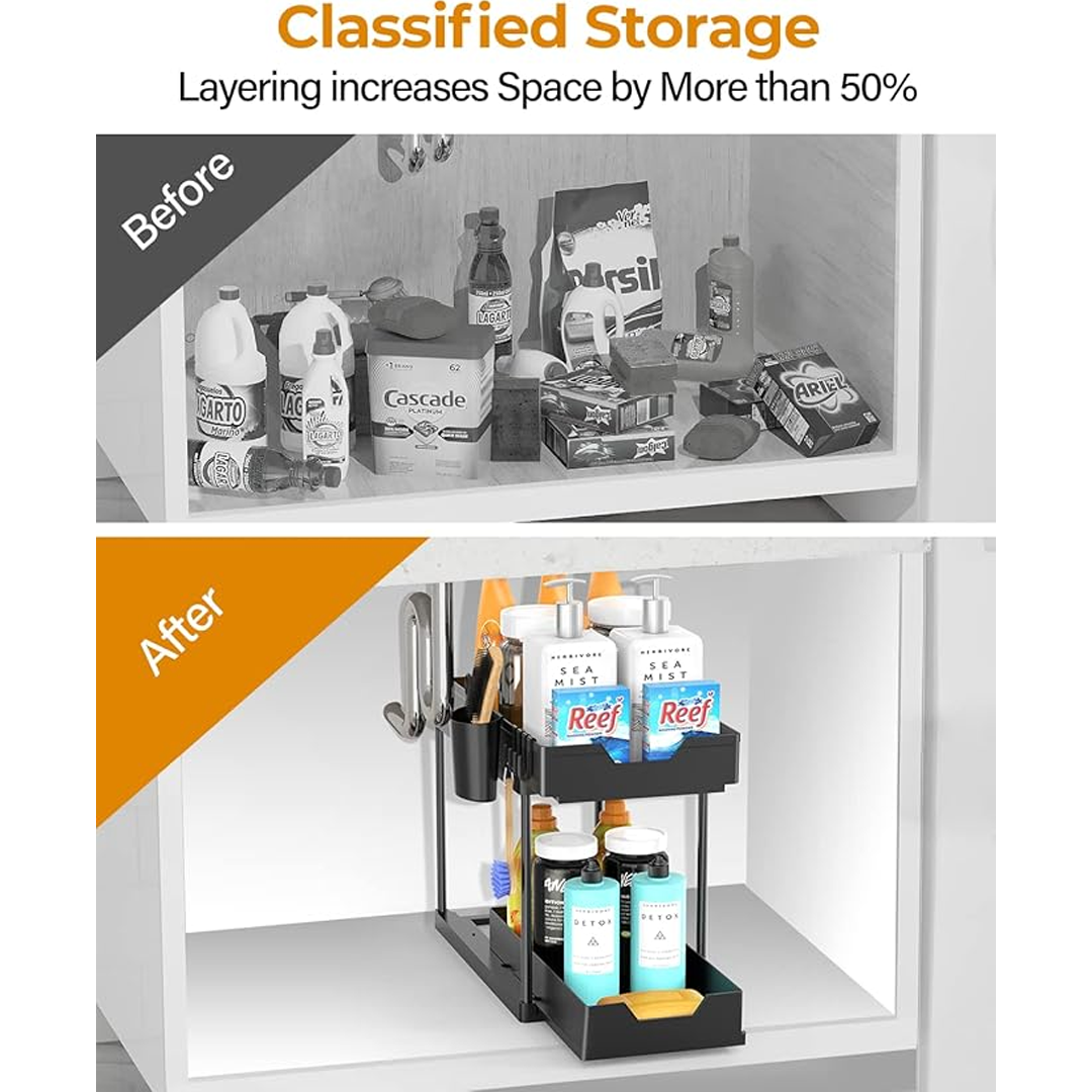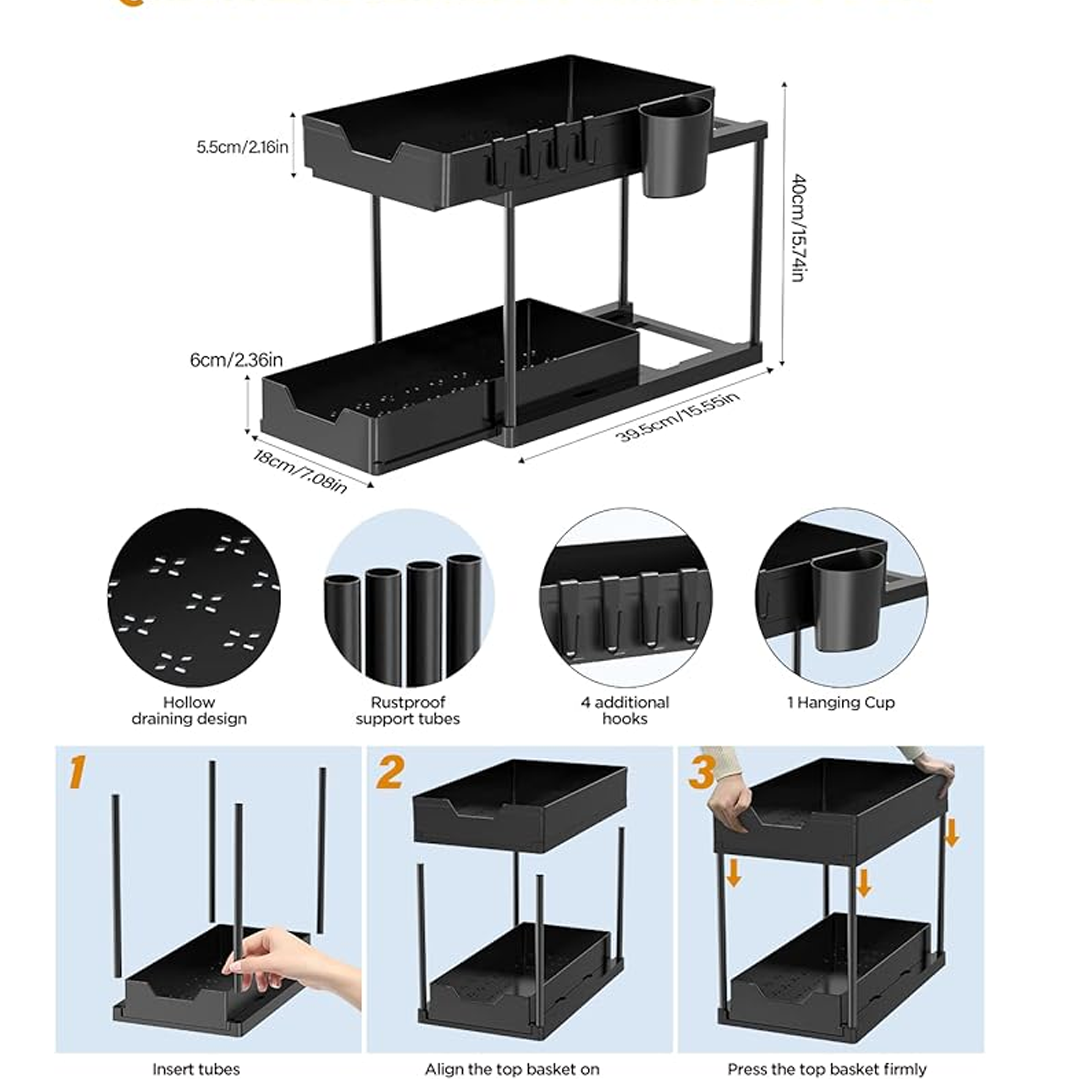 Ovaj višenamjenski organizator za ispod sudopera idealan je za sve koji žele maksimalno iskoristiti prostor i držati svoje stvari uredno organiziranima i lako dostupnima.